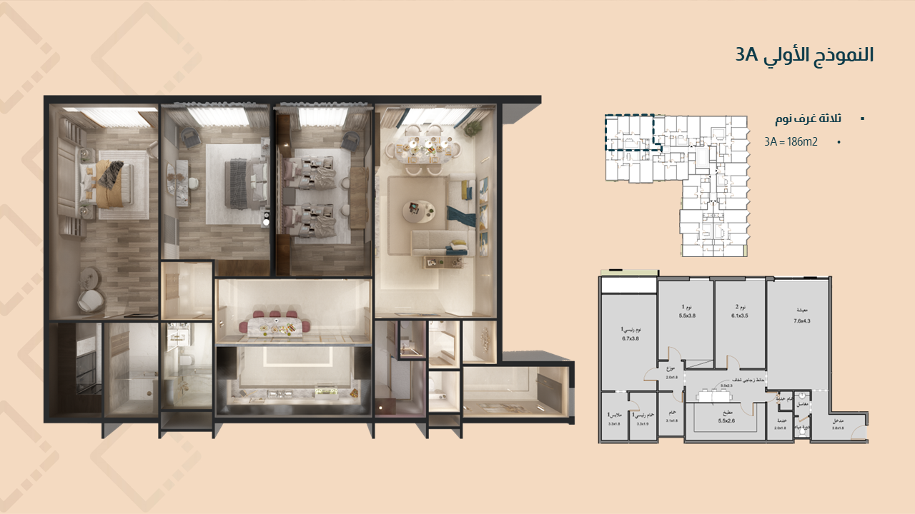 Site dimensions: 100m x 100m Land area: 10,000 m² Number of Levels: 6 Ground Floor = 1767 m² Typical Floor = 6624 m² x 4 Levels Annex Floor = 3506 m² Built-up area: 31,769 square meters Total apartments: 152 flanges